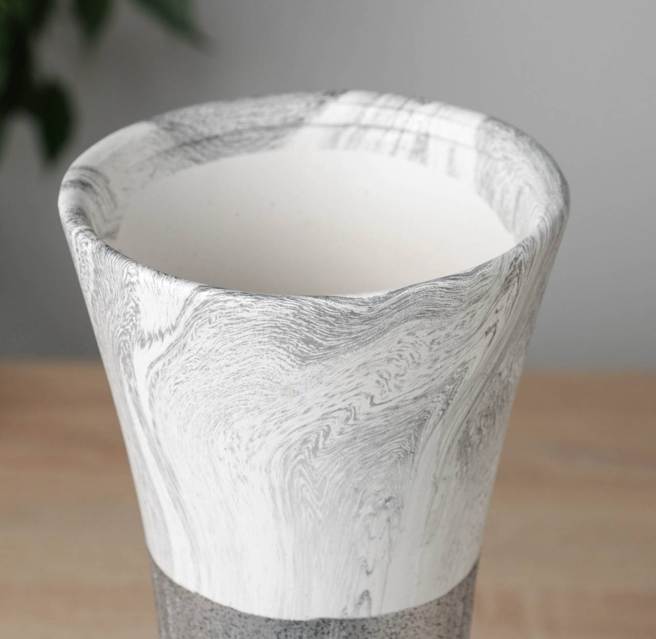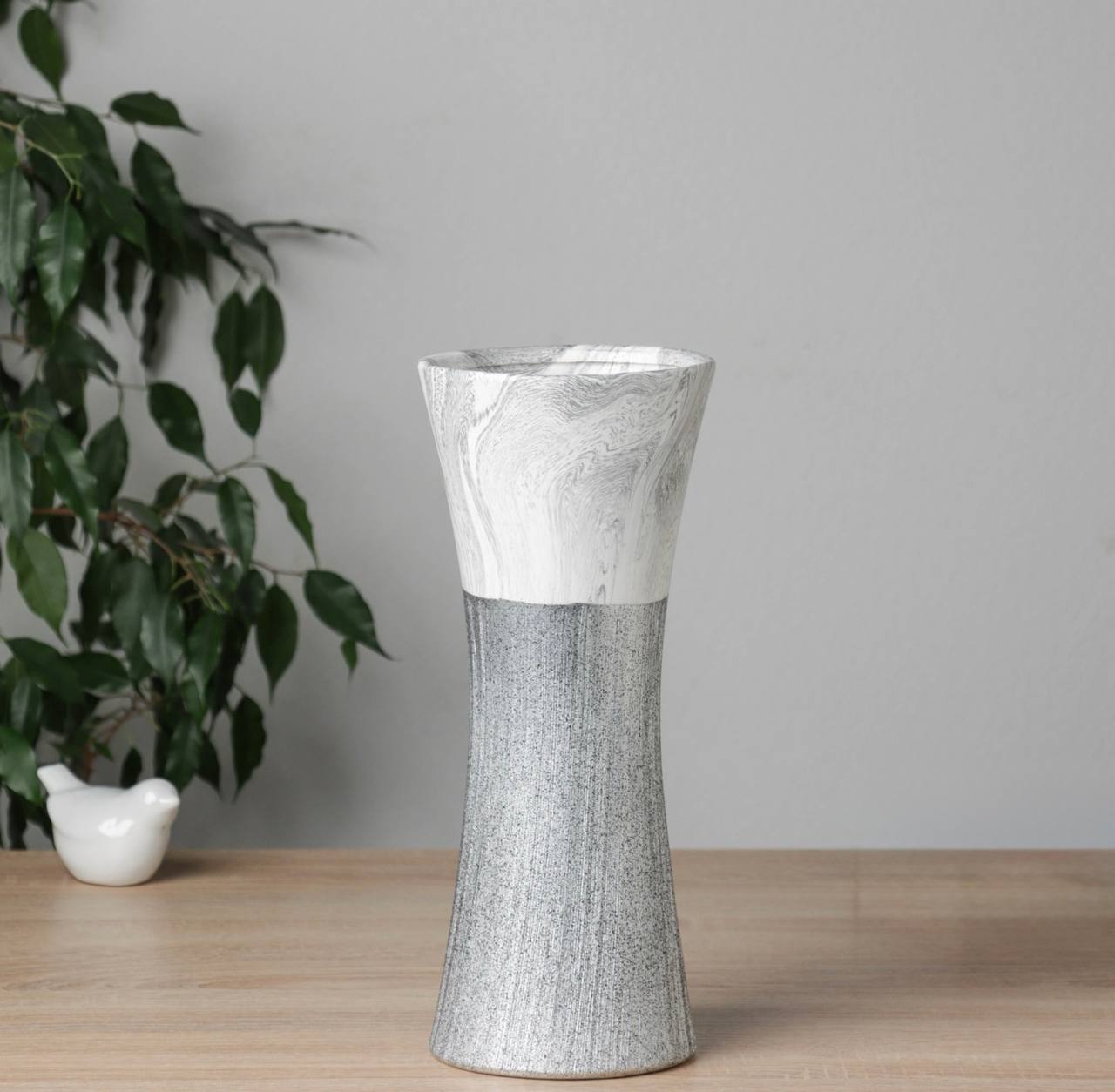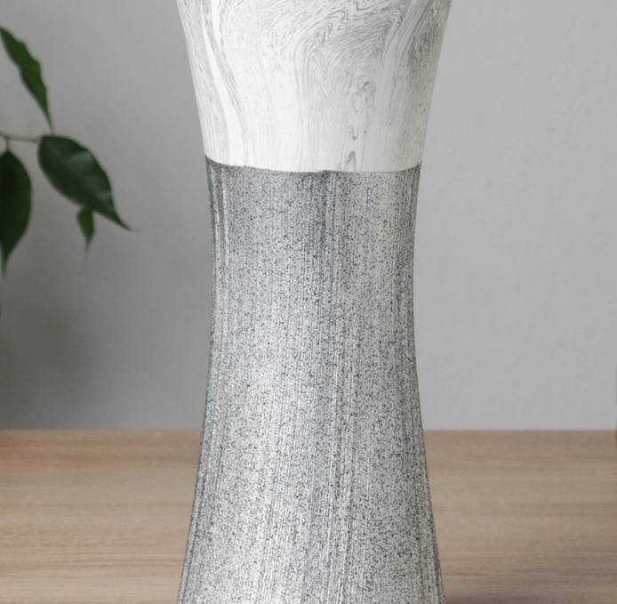 The Aurelia Tall Vase celebrates simplicity and balance with its two-tone design. The smooth marbled white top contrasts gracefully with the textured grey base, creating a refined interplay of light and shadow. Its elongated, gently flared shape makes it perfect for showcasing long-stemmed flowers or standing alone as a sculptural accent. Combining modern minimalism with timeless elegance, this vase elevates any space with understated sophistication.